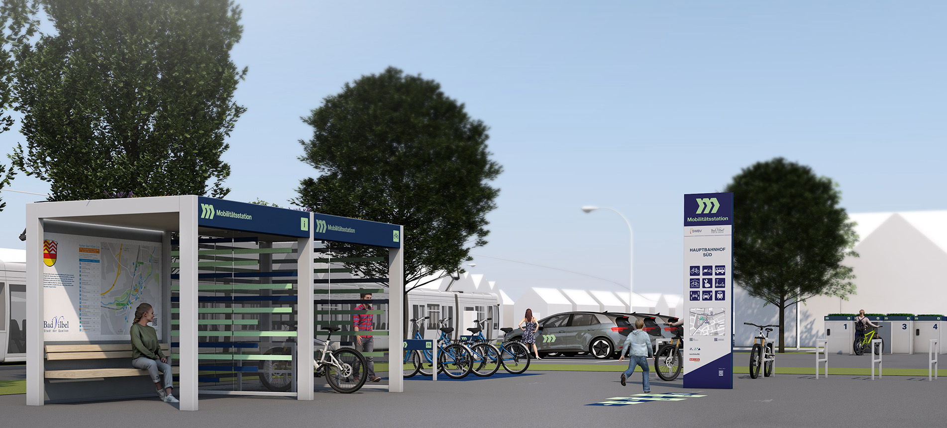 A memorable, continuous banderole visually connects all modules of the mobility stations and makes the mobility services clearly and visibly recognizable in public spaces. It serves as a key design element and creates a high degree of recognition.
